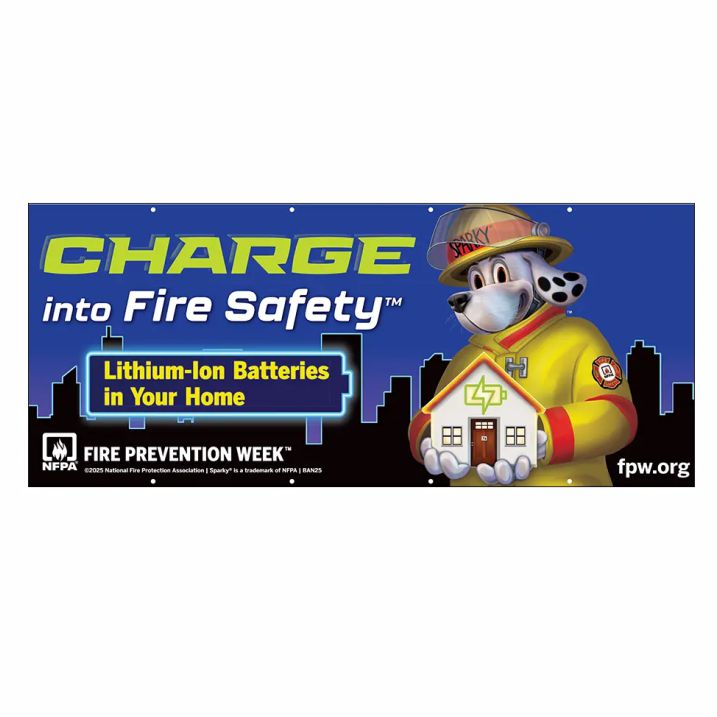 This Fire Prevention Week banner, which is made of eco-friendly fabric with a fire-resistant coating, is the perfect backdrop to raise awareness about using lithium-ion batteries safely in the home.