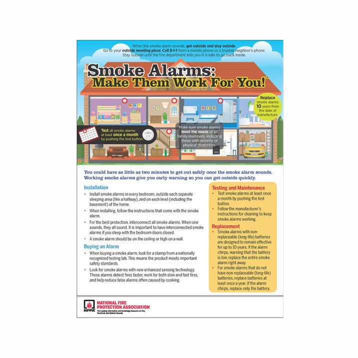 This full-color, dual-sided tip sheet provides information about smoke alarm installation, choosing a smoke alarm, and when to replace. It also provides useful information to remind homeowners to test all smoke alarms at least once a month by pushing the test button and ensuring it’s in working condition by following simple maintenance instructions.