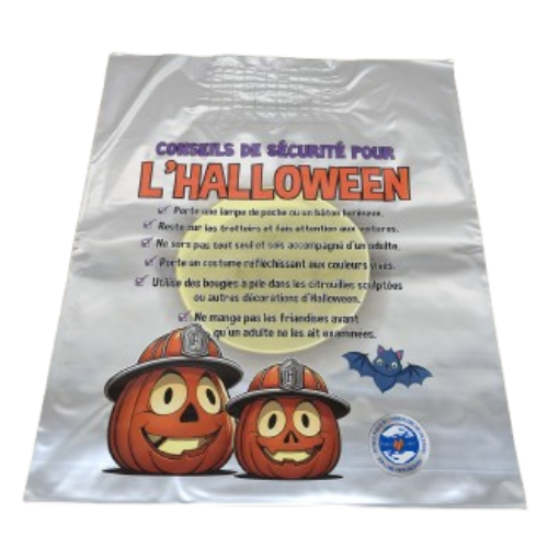 Reflective Halloween treat bags with safety messaging and engaging illustrations.
