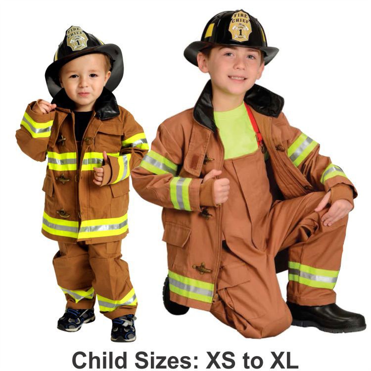 Kids love to look like their firefighter heroes and this realistic looking turnout gear is just the thing to put a smile on their face. Children's sizes come with a sturdy plastic fire helmet. Turnout gear is also available in black upon request. Ask us about personalization options.