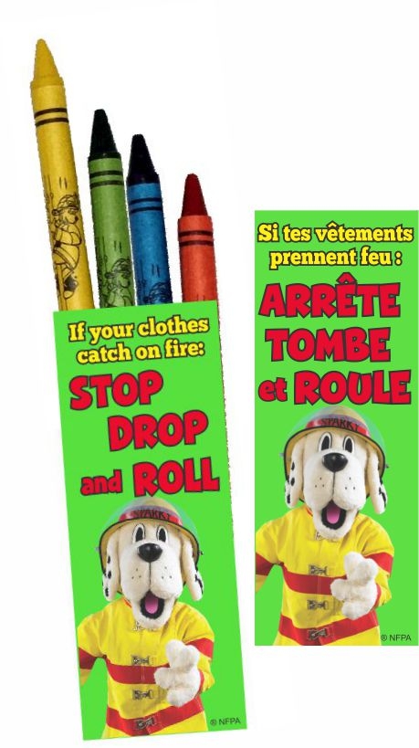 Perfect for the younger children. Each box of 4 non-toxic crayons comes with the image of Sparky and the important message "If Your Clothes Catch on Fire, Stop, Drop and Roll" on the box. English on one side and French on the other.