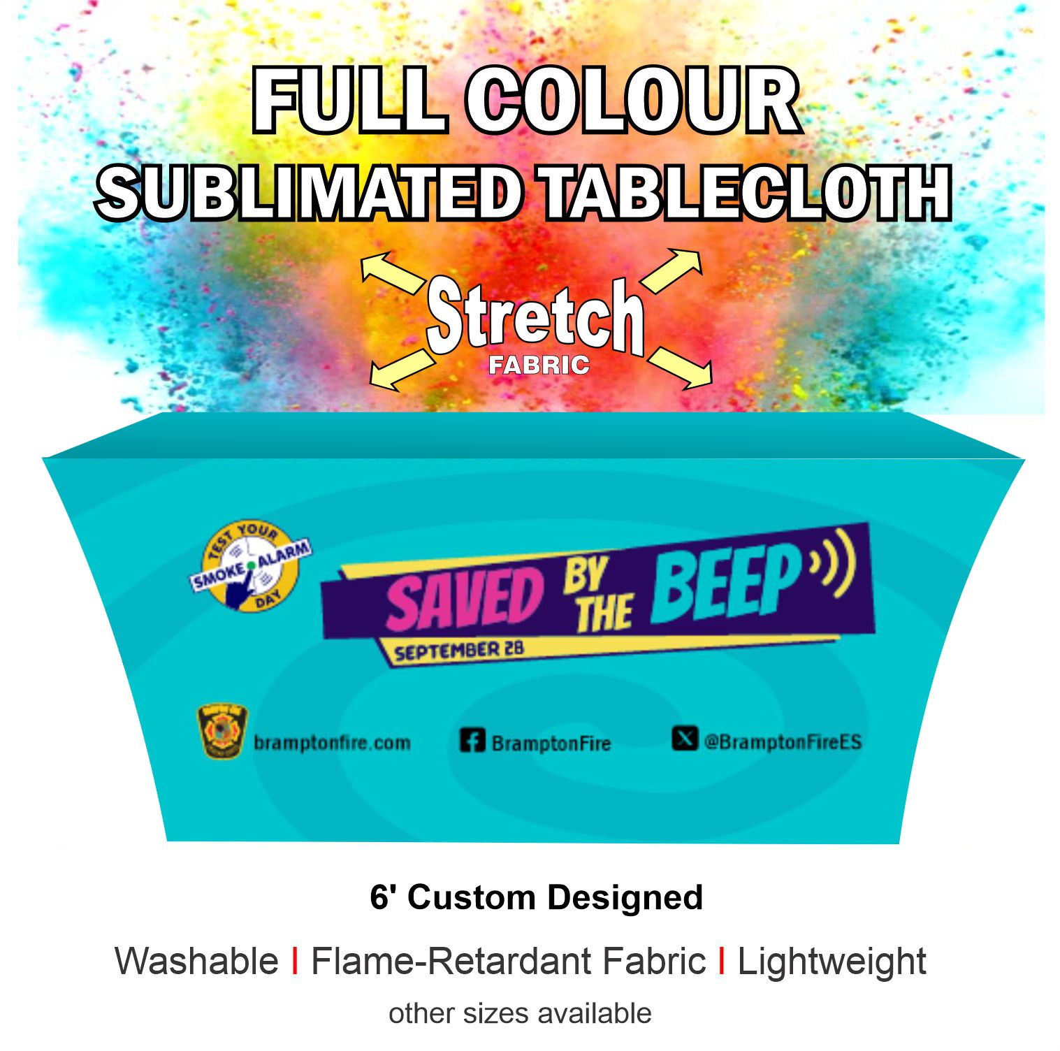 Complete your presentation with a stretch, dye-sublimated printed tablecloth. Stretch tablecloths are tailored to fit a standard 6ft tables from top to bottom, providing a stylish, customized and branded appearance for use at events, trade shows and in retail environments. Table throws are fully-printed on washable polyester using dye-sublimation and include a back zipper for easy application.
