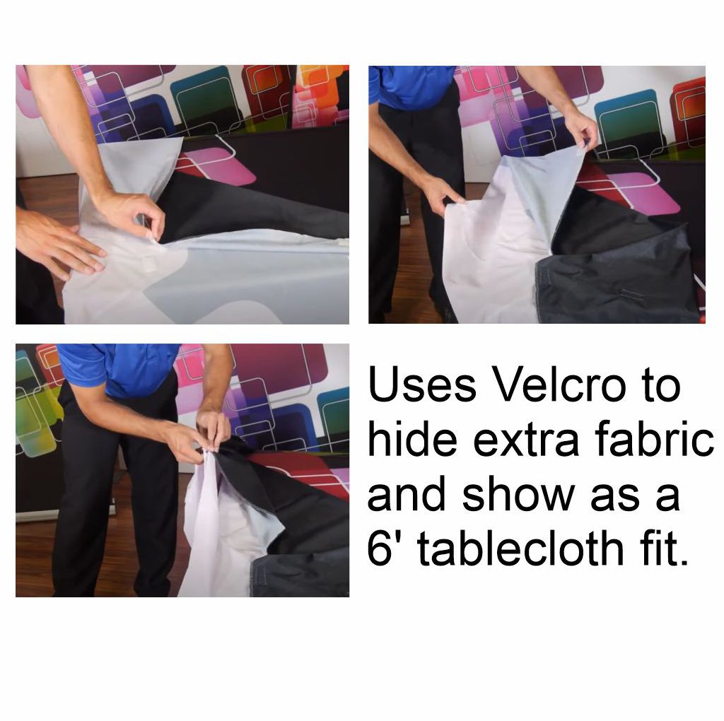 Our premium fully-printed convertible tablecloth allows you to quickly switch between an 8ft table cover and a 6ft table cover using the velcro strips attached. Eliminates excess fabric draping on 6' tables. Convertible tablecloths are printed using full-coverage dye-sublimation, with custom full-color graphics on washable polyester. Add a customized, professional branded look at any sales event, trade show or in retail environments!